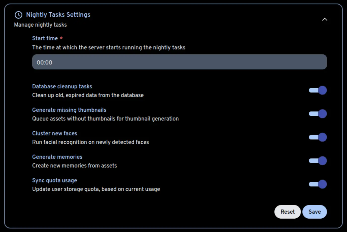 Additionally, some jobs (such as memories generation) run on a schedule, which is every night at midnight by default. To change when they run or enable/disable a job navigate to System Settings -> Nightly Tasks Settings.
